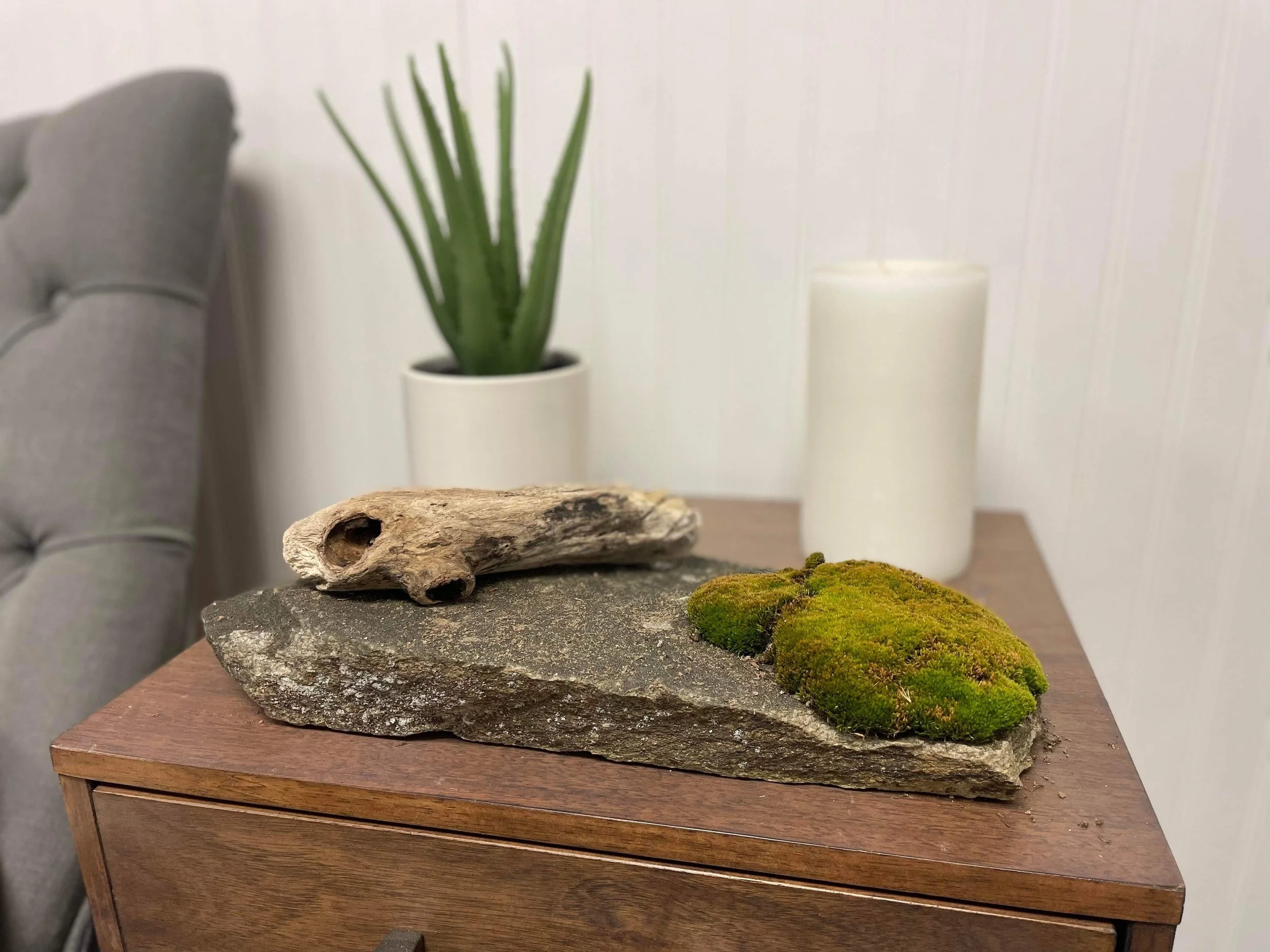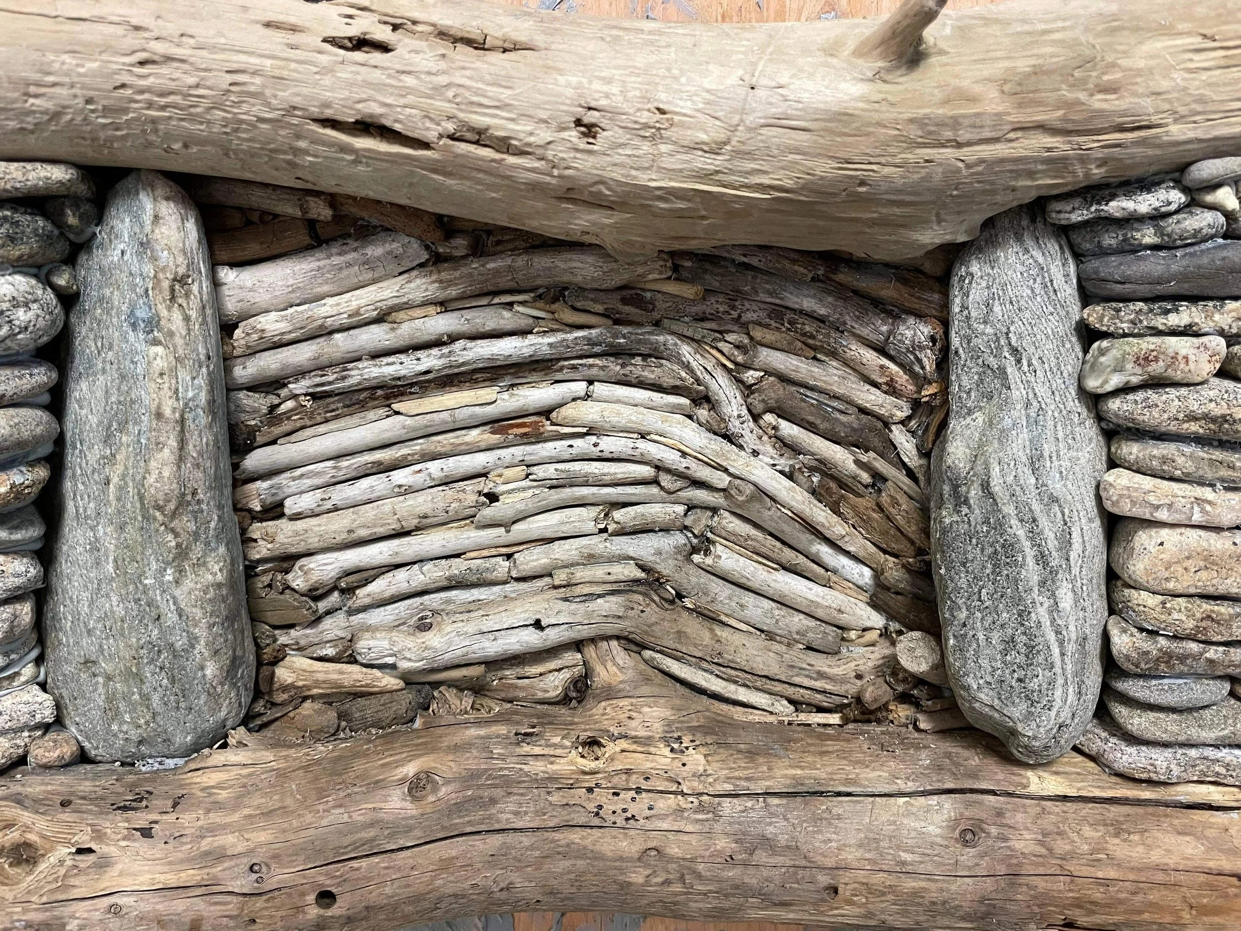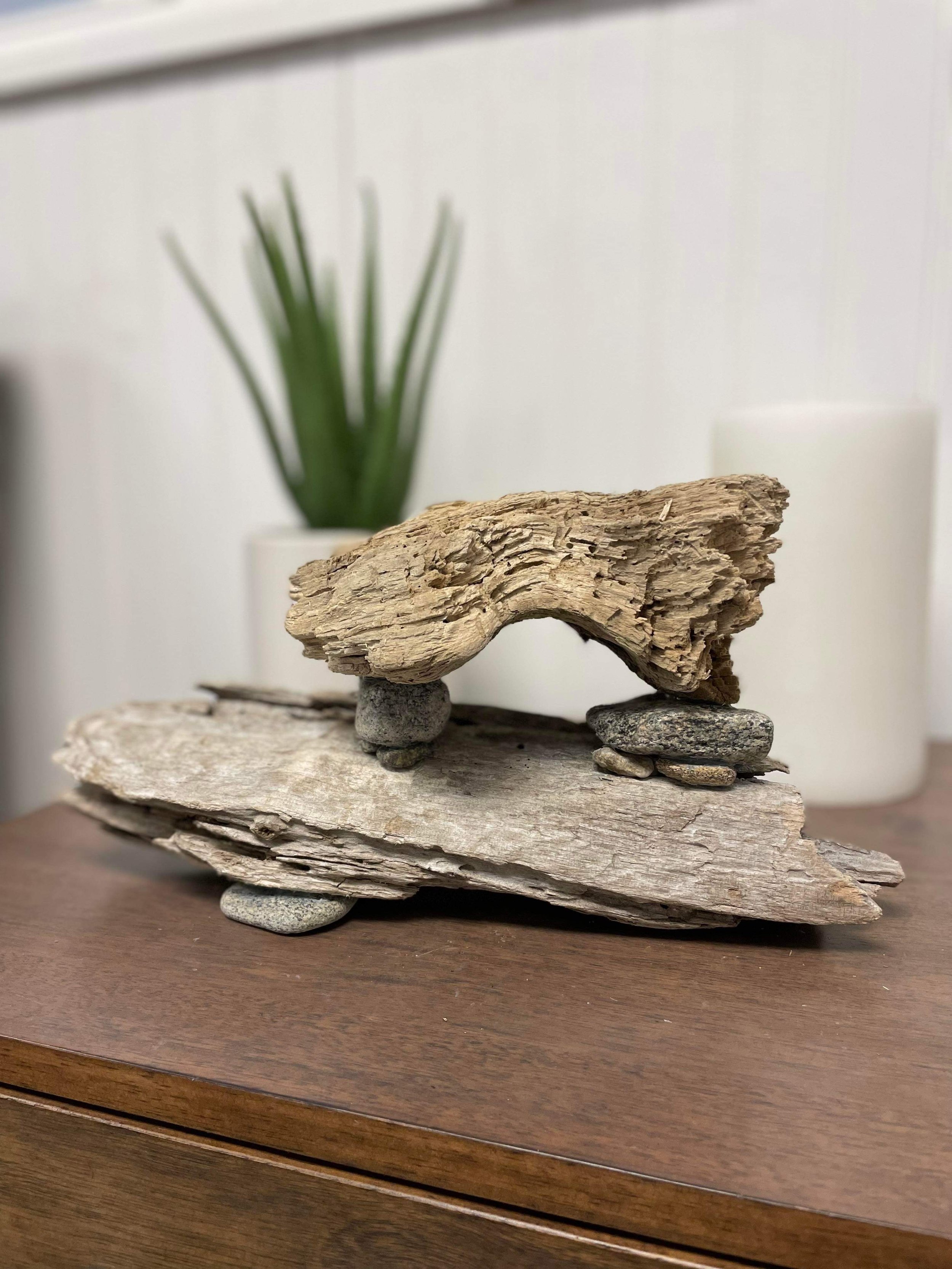 Bring nature indoors with a one-of-a-kind art piece crafted with locally sourced New England stone, weathered granite, and driftwood. No two pieces are identical and cannot be duplicated, making these sculptures incredibly unique.